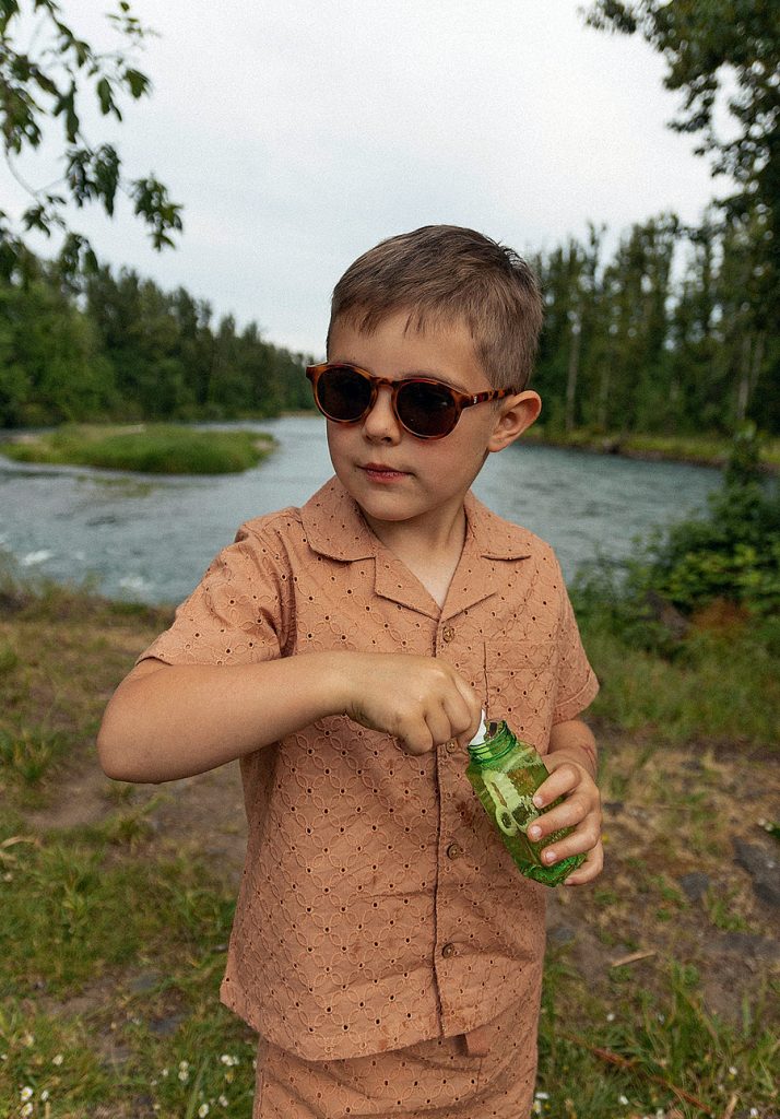 Makemake Organics’ eyelet button-down and shorts in pale dusty rust, are made for the quietly confident young man (2-5T). Seen at the Sweetpea Showroom at Playtime New York’s Spring 2026 wholesale children’ fashion trade show. -Tina Barry