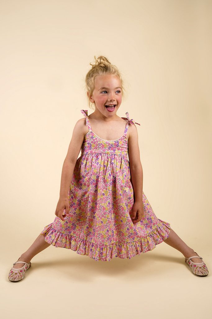 Early Sunday’s Spring 2026 sweetly feminine dress is alive with tiny flowers, a scoop neck, flirty ties at the shoulder and a generous ruffled hem. Seen at Playtime New York’s Spring-Summer 2026 wholesale children’s fashion fair. -Tina Barry