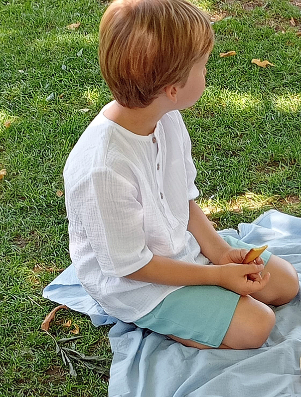 Talk about easy elegance for Spring 2026! Portugal-based Children’s Co. offers boys a collarless shirt, cut loose and textured, to wear with comfortable shorts in fresh seafoam blue. Contact Lemonade Stand Showroom at the Apparel Mart at America’s Mart Atlanta. -Tina Barry
