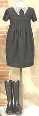 Favorites: The charcoal dress with the crocheted collar is a perfect example of the I Pinco Pallino aesthetic: The feminine curved lines and pretty detail near the neckline are tempered by the masculine color and minimalist seams. The tough, boy-like boots are a true I Pinco Pallino touch.
