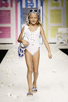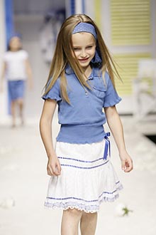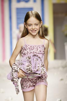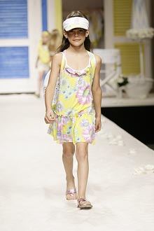 Pitti Bimbo Spring/Summer '08: On the Runways - Designers Hit the Beach, the Rugby Field and Even Outerspace I need a word with the organizers of Pitti's runway shows. Last season, I was served flutes of champagne and lovely hors d' oeuvres before the children hit the kitten walk. This time - nothing! Not even a cracker. What they did provide, were some highly theatrical productions. Although none of the shows rivaled a Stephen Speilberg spectacle, some packed plenty of entertainment value. The giant phone that hung on the stage at Nolita Pocket and was answered by one of the models had a surreal quality; Miss Blumarine featured beach cabanas and a sand covered runway with the romantic quality of a vintage postcard; and the miniature poodles that accompanied models down the Miss Grant runway turned each little girl into a mini celebrity. Gas blew the stops out with a real rugby field, bleachers, a live game and an awards ceremony. And, yes, they showed fashions, too. The shows were held over two days, breaking up the rounds of cocktail parties, booth events and, of course, perusing the collections.