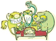 JORDY BLUEPRINTS Homebase: Woodbury, MN ARTIST: Jordan M. Hansen Sizes: 14" x 18"; Wholesale price: $10 Forget nightmares. This gang of goblins look like they're up for a good time. (The boys' version of the print swaps the red blanket for deep green.) Hansen's note cards and poster/calendar feature similarly striking graphics.