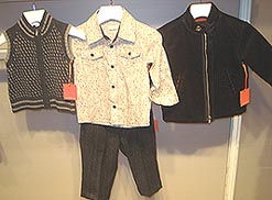 The boy's shirt is patterned, the pants are pinstripes and the vest adds still more pattern. All together, the look is understated. The black corduroy jacket in the chic racing shape will work with anything in a boy's closet. Tel: 609-799-8448 E-mail: sales@ferdkids.com