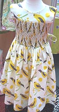 Outstanding offering: This dress is for the birds and I mean that in the most flattering way. The print of happy yellow sparrows is a find and that deep mid-chest to waist smocking resembles a lacey birdcage. Lovely. Tel: 718-301-6820 E-mail: Simone@floretnyc.com