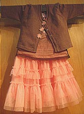 Outstanding pieces: There's a lot of subtle layering in this girl's outfit. The pale cocoa knit cardigan gets a hit of peach tulle with the interesting snap coverings while the tee is given dimension with a sheer overlay. That skirt, in the prettiest shade of dusty peach, is soft to the touch and the tiers add more dimension.