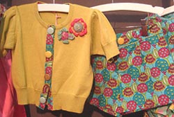 MISHA LULU Homebase: South Pasadena, CA DESIGNERS: Karen Moran-Salazard and Joe Salazard Sizes: 3 months to 8 years; Wholesale prices: $15-$33 Some people (me included) think of the 1970's as the heyday of children's fashion. Shapes were sweet, colors could be unapologetically tacky and, whether it was hand crafted or not, manufacturers aimed for a "made by grandma" feeling. Misha Lula taps into that time with patterns that mimic patchwork quilts, the quintessentially 70's big-eyed girl motif, and folkloric screenprints. Can you tell I'm a fan?