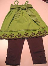 Outstanding piece: When dollars are tight, a garment that does double-duty is more attractive than ever. Here the smocked top tunic turns into a pretty skirt. Just tuck in the straps and pull it down to the waist. The leggings gather gently below the knee and sport a three-button detail.