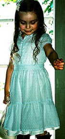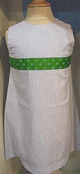 Outstanding piece: A girl can't help but look fresh and pretty in this A-line blue and white stripe seersucker with leaf green and sky polka dot grosgrain ribbon edging the bodice. The back closes with a row of deep rose-colored buttons. Tel: 401-245-3031 E-mail: Info@tiny-bubbles.com