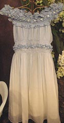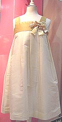 Outstanding piece: This raw silk-look dress brings a flattering gold tone to a pretty girls neck and shoulders. The full skirt with large pleats covers what needs a little camouflage without making the dress look dowdy. Tel: 800-870-6603 E-mail: Renee@jellybeanmiami.com