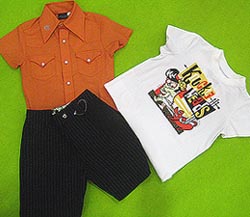 Outstanding piece: He's the boss when he wears the bright orange Western shirt over the funny tee and the pinstriped Mob shorts made of soft suiting material. Tel: 360-696-9744 E-mail: Info@knuckleheadsclothing.com