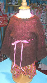 Outstanding Pieces: I love the way the pink velvet ribbon turns this lacy chocolate sweater into something special. It looks great, too, with the coordinating raspberry tee and mod Sixties' flowered bells. Tel: 858-824-1700