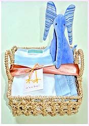 Outstanding Pieces: The woven straw gift basket holds a soft wrapped set in pink and rose edged in red for girls and pale blue and navy with tomato trim for boys. Each basket includes a little stuffed animal. The look is cute but not over the top sweet. Tel: 917-664-0148 E-mail: lynne@loralindesign.com