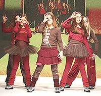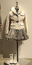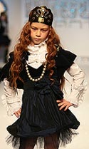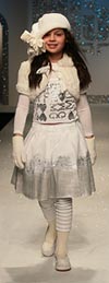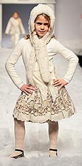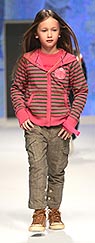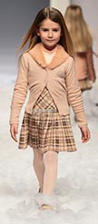 Cocoa looks rosy at Dimensione Danza. -Cream -Dark leaf green and rich orange -Red -Silver-blue Join the navy. The color is shown very dark and tinged with green. The hue appears in all categories and for girls and boys. To take the formality out of the color, designers often sprinkle a garment with rhinestones or, for boys, use the tone as a backdrop for deconstructed appliqués. Navy and -Deep teal or jade, sometimes paired with mustard -Silvery blues -Slate and pink In activewear: -Deep red or bright tomato -Vivid orange