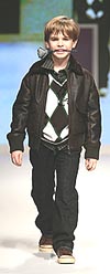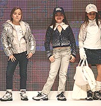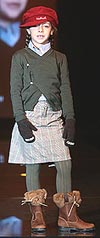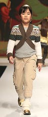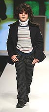 I Pinco Pallino's buttercream dresses. Combat boots bring a tart note to the all sweet palette. Turn up the volume. While the larger, more commercial manufacturers favored, grays and silvers, rosy tones, black and navy, some smaller more esoteric collections favored rich, saturated bright tones of taxi yellow, chartreuse, jade, leaf green, pimento and fuchsia. To balance the hot hues, designers included a few separates in black, charcoal, cocoa and navy. Boys are boys. Boys' activewear stays traditional with navy, forest green, mustard and deep red. Shots of bright orange and red jazz things up. Black. Often shown in tight, punky straight legs with matching jackets, offers relief from preppy wear.