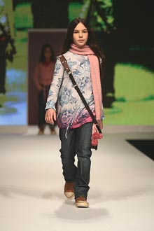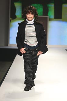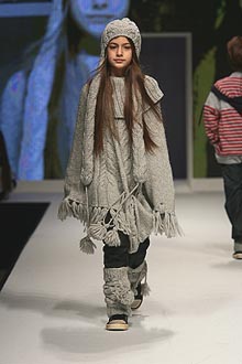 Working with a palette of black, navy, gray and rose, the designers at Gas Junior dressed up denim with pin-stripes and took the glitz out of silver by knitting the hue into chunky, earthy shapes.