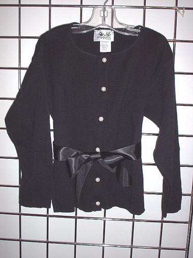 Product Line: Style 610: Ribbon Belts. So pretty, classic, 100% cotton sweaters. White, pink, ivory, black, navy sizes 3m-24M, $15; 2t, 3t, 4t, $16; 4, 5, 6, 6x, $17; 7, 8, 10, 12, 14, $18. White available 3m-size 14, ivory 6m-14, pink 6m-8, black and navy girls size 6-14. Made in the USA.