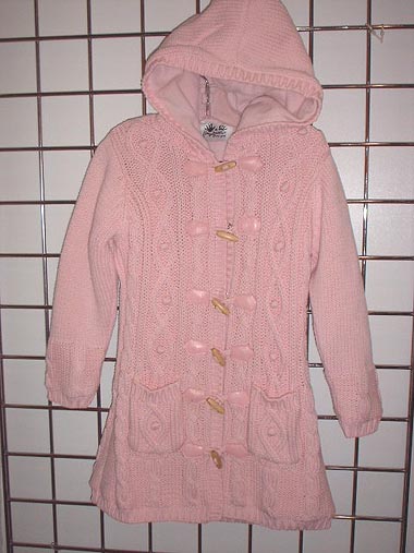Product Line: Style 5000 Cabled Sweater Coat. 100% cotton shell, polyester lining. Made in China. Sizes 12-24M, $27; 2t/3t, 4t/4, $28; 5/6, $30; 7/8, $32. Pink or Navy.