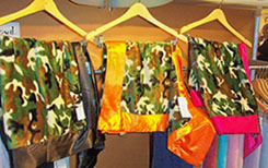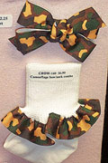 THE SOCK CONNECTION Handmade, beaded socks and hair accessories Designer: Leslie Schumacher Size: Infant, toddler, girls 4-6x, girls 7-14 Wholesale: $1.50-$7 Standouts: The socks decorated with beads and bows, which are a brand new product; the medium sized camouflage printed hair bow, the camouflage bow/sock combo.