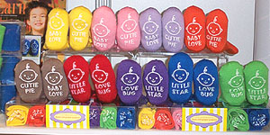 FYI: Jenny is a sculptress by training and when she started her business, she made only plate sets. She strives to make "truly unique things that other people aren't making" and is proud that she is the "only person who puts a cute graphic written in non-skip rubber, on the bottom of a sock." Tel: 212-777-5332 E-Mail: jenkra@aol.com