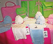 MAMA & BAMBINO A collection of high quality, practical and fashionable coordinated blankets, diaper bags, hats, and onesies Designer: Stephanie Frazier Grimm Sizes: Infants 0 - 6 Wholesale: $7.50 - $15 Standouts: The 'Twinkles' hats, tees and baby bags embellished with sparkling custom crystal letters; the cozy "Lovies" and cuddly blankets with crocheted bunnies or ducks; the "Newport" ribbon trimmed canvas baby bags in an assortment of colors, styles, sizes.