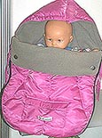 7 A.M. ENFANT An extensive collection of quilted nylon poly filled baby outerwear Designer: Rebecca Campora Sizes: 0 - 3 years Wholesale: $50 - $89 Standouts: "Le Sac Igloo 500", "Blanket 212 Evolution" (a photo of Kate Winslet using this item, with her twins inside, ran in the November 2006 issue of "US Weekly"); "My mini sac igloo" made especially for your child's dolls, "Pookie Poncho", "Duo" double stroller cover, and mittens, booties and hats all of which are new.
