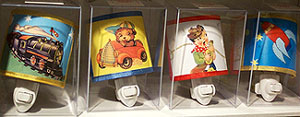 WHIMSY DESIGNS Baby accessories, handmade room accessories, gift items that are decidedly whimsical and playful. Designer: Jasmine Redfern Size: Nursery through age 6 Wholesale: $9 - $55 Standouts: The playful trompe l'oeil bibs; lamps, night lights, and the "Good Night Lights" nightlights.