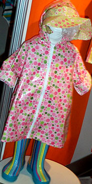 PLUIE PLUIE A division of Im-Link Corp., they specialize in European designed 100% cotton coated whimsically patterned rainwear. Pluie Pluie means 'rain, rain" in French and these pieces are so irresistible, you and your little ones will definitely not be singing, "Rain, rain, go away". Designer: Sonja Snavely Size: 1-8 years Wholesale: $2.80 - $18.50 Standouts: The polka dot umbrella and raincoat, striped rain boots