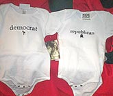 Terra Traditions' Flower Fairies Gilded Book. I never tire of pointing out that the notion of seasons has become all but obsolete (in every sector of the market, from accessories to clothing, and for every age group), thanks in large part to globalization, technical advances in fabrics, and of course, Global Warming. Speaking of which, Global Warming has really become a reality, which was perfectly exemplified by the glorious, very UN-winter like weather which accompanied the show. Almost record breaking temperatures (in the 50's and 60's) on the first few days of the New Year provided a perfect backdrop and it afforded show attendees a good excuse to take their buffet lunch al fresco, while enjoying the sweeping Hudson River views from the Jacob Javits Center, (the traditional venue of choice). When the topic of conversation was not centered around the gorgeous weather (or the wonderful merchandise, of course), it was about, you guessed it politics. Since the three-day Children's Club was literally sandwiched in between the Iowa and New Hampshire primaries, world affairs and especially politics seemed to be on many of our minds. And in fact, it was hard to escape this 'reality check', even as I made my way through the aisles in search of the best accessories for newborns through tweens. Everywhere I looked, there were slogans, mantras, peace signs, AND in one booth, baby T-shirts emblazoned with the words, "Democrat" and "Republican".