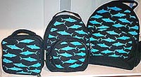 FOUR PEAS Backpacks, lunch bags, and messenger bags for the entire family Designer: Casey Baca Wholesale: $9 - $21.50 Ages: 1 - adult Standouts: The toddler/ school backpacks and lunch bags printed in Polka Dot, Funky Monkey, Funkier Money, and Sharky; The Biker and Rocker messenger bags.