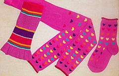COUNTRY KIDS Whimsically colored, patterned, and textured children's hosiery and socks Designer: Jo Sherratt Sizes: Preemie, layette, infant, toddler, girls 4-6X, girls 7-14, boys 4-7, boys 8-20 Wholesale: $4- $11 Standouts: Mix patterned multicolored striped legwarmers, heart patterned 'Footloose' tight, heart patterned socks; black microfiber opaque tights accented with lurex bows