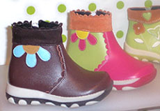 ECCO USA, INC. Well established Danish footwear brand whose motto is "Shoes designed to move you" Sizes: Infant, Toddler; 1 year to 9 or 10 Wholesale: $20 -$55 Standouts: The Gore-Tex pink and blue suede athletic style low booties with molded rubber soles and Velcro side closures; purple and brown side zipped, lace up mid calf suede boots on a molded rubber sole with floral embroidery on top which exemplify 'form meets function'.