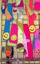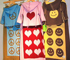 'Signs' of the Times: Peace, Love, and Happiness at Children's Club Spring 2007 Show Is it just me or did there seem to be a disproportionate number of peace signs, smiley faces, and hearts (those very symbols of the freewheeling, free spirited, rebellious 60's) decorating, sewn or printed on every manner of accessories being shown for newborns, toddlers, and tweens at the Children's Club? And I can't leave out all the tie dye, patchwork, flowers ("flower power"!), hand knits, ponchos, and earth-toned suedes. It was as if designers banded together in anticipation of a whole new generation of optimistic, idealistic hippies and flower children. Of course, I'm joking I'm hardly suggesting a two-month-old infant is actually choosing his or her own hats, scarves, onesies, bags, blankets, burpies, shoes...or consciously setting out to make a fashion - let alone a political statement. But it does look as though manufacturers and their reps were hoping to woo and appeal to the customer who appreciates the mood, and/or attract the one who has already 'been-there-done-that' be it mom, dad, aunt, uncle, grandma or grandpa (or family friend). Speaking of peace signs, unfortunately, where there's peace, there's war. I couldn't help but notice the preponderance of camouflage prints - not only on show attendees (of all ages AND both sexes) but filling the booths where they emblazoned everything from teeny tiny stroller shoes and medium sized backpacks to gigantic blankets. Admittedly, camouflage prints are not 'new', but they are always in 'style' and in fact, were a big statement on influential international runways when designers presented their women's ready-to-wear collections for Fall 2006. And perhaps at this moment in time, given current world events, peace signs and camouflage prints have suddenly seemed to take on a new, more poignant meaning.